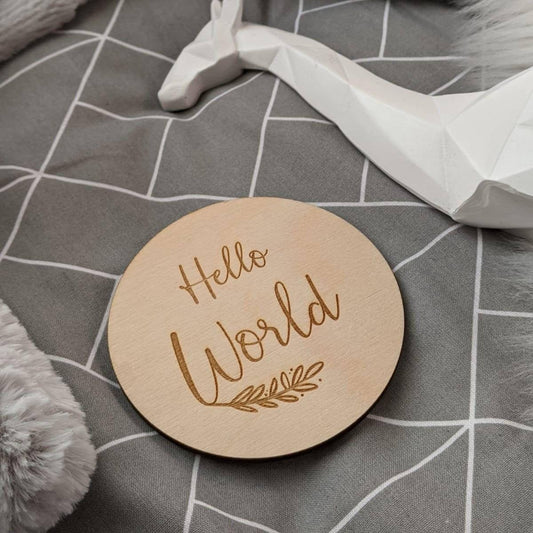 Hello World Baby Announcement - Engraved Wooden Pregnancy Announcement Plaque - Baby Milestone Card