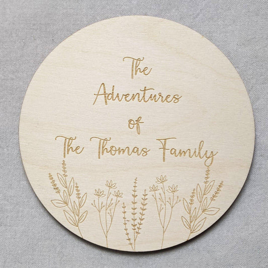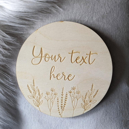 Personalised Wooden Disc Engraving with Wildflowers - Flat Lay Prop - 14.5cm